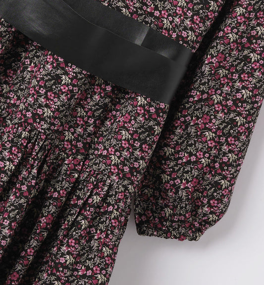 Vestito manica lunga in fantasia con cintura in raso